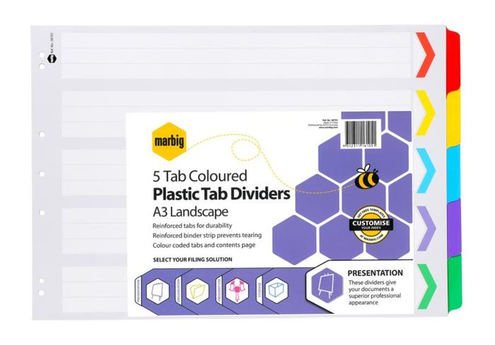A3 COLOURED PLASTIC DIVIDERS, 5 TAB LANDSCAPE