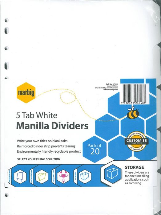 White economy dividers with a rienforced binding strip to prevent tearing. Wrtie your own titles on the blank tabs.